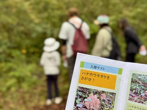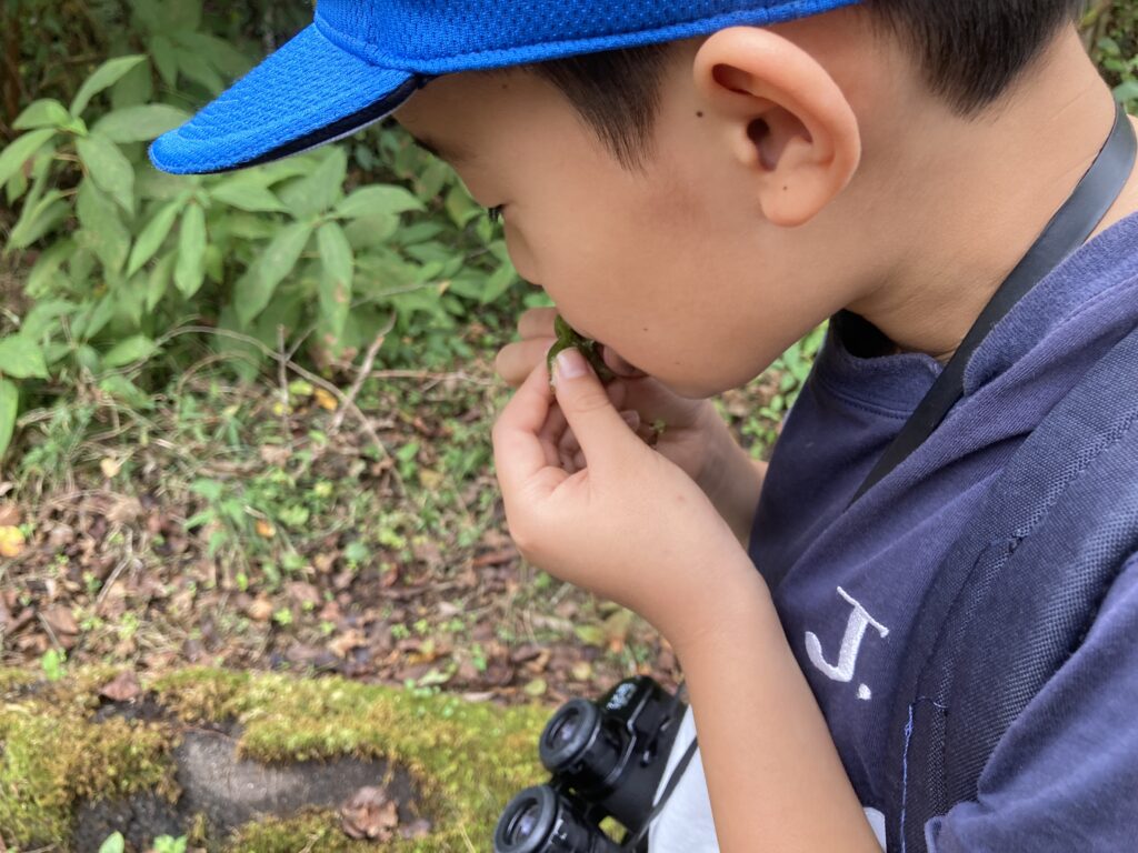 指令書に書かれた植物やキノコ、そして双眼鏡の練習をしながら、自然の中を探検しました。普段は見過ごしてしまう花やキノコを見つけては驚きや発見の声が上がり、笑顔でいっぱいでした。
