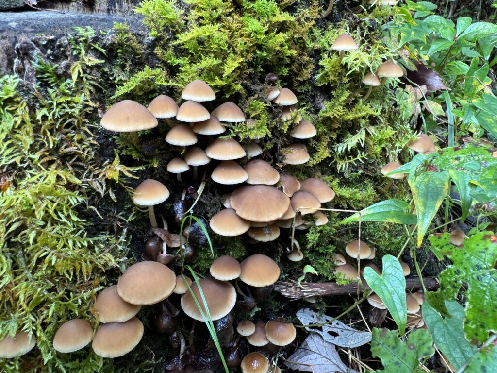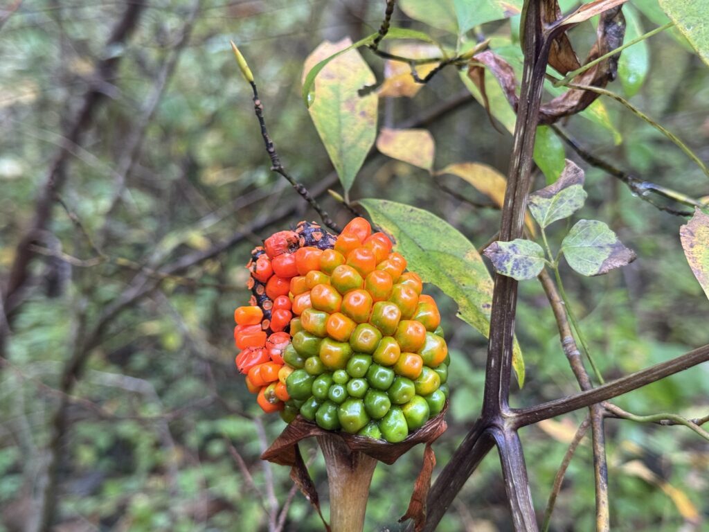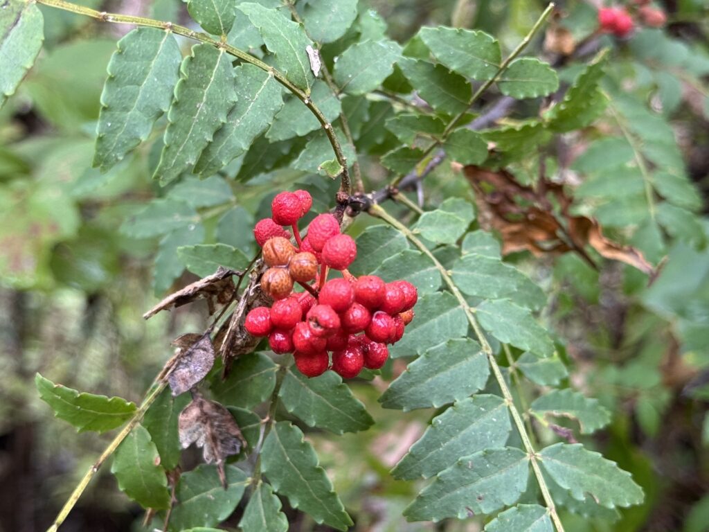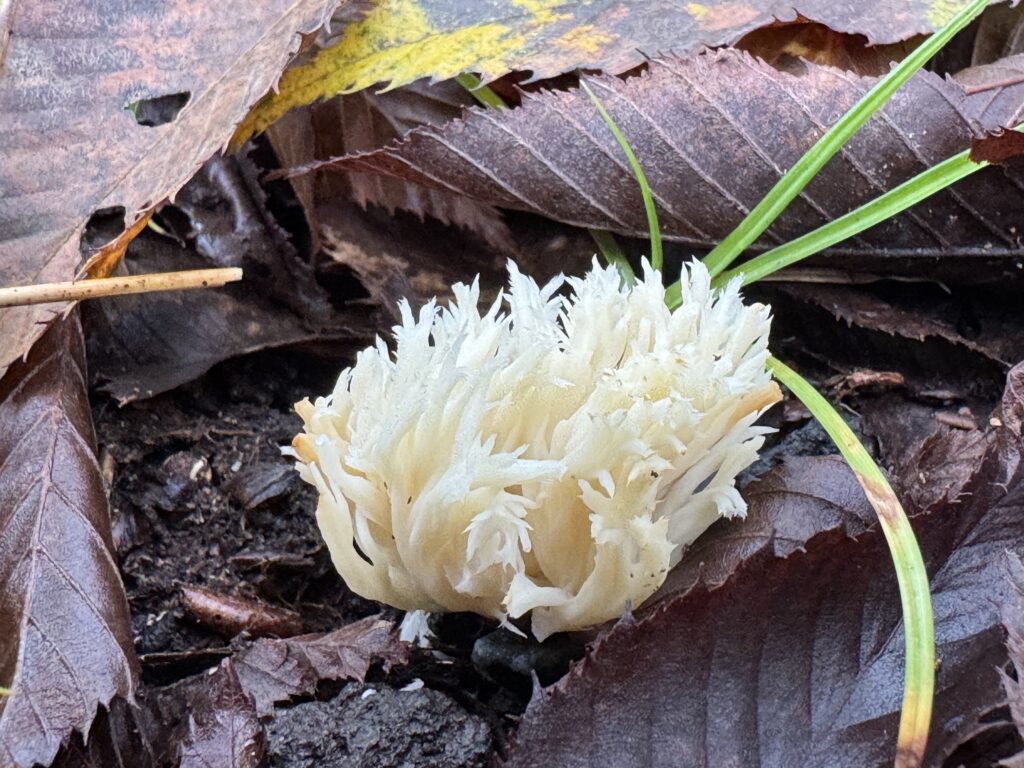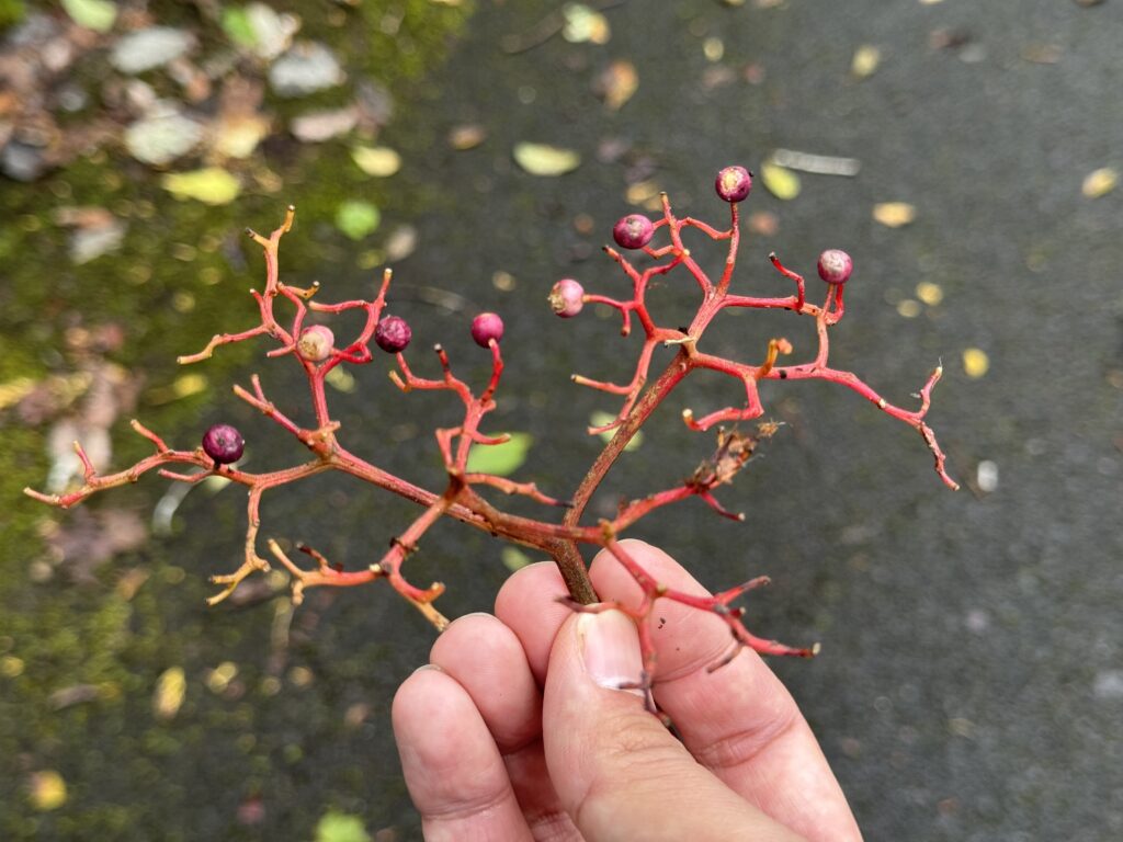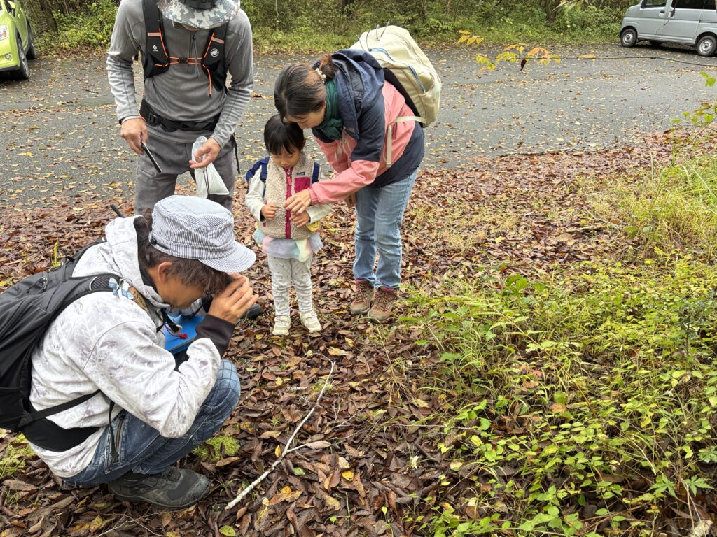 前日の雨の影響か、園内ではさまざまなキノコが顔を出していました。歩くたびに新しい発見があり、「これもキノコ?」「かわいい形をしてる」と立ち止まっては観察。足元に目を向けて自然を楽しむのもいいですね。木の実もあちこちで実り、色や形の違いを見比べながら進みます。