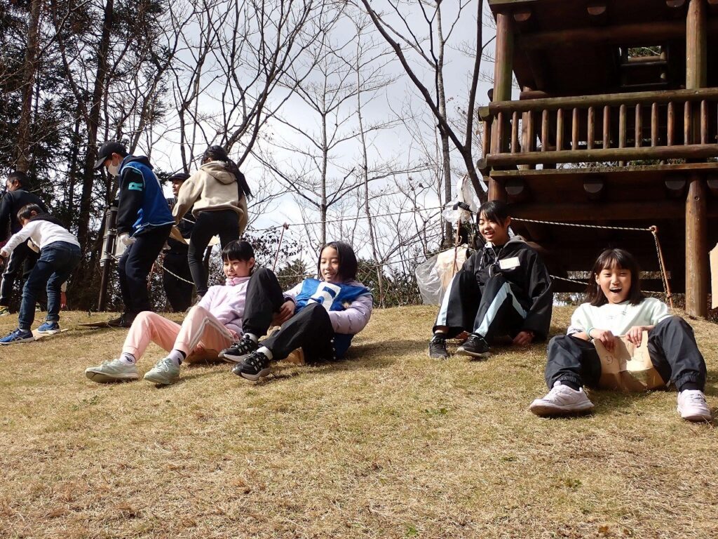 また、子どもたちに大人気の芝すべりも行いました。段ボールの上に座って傾斜を一気に滑り降りる体験に、笑顔が止まりません。自然の遊びの楽しさを実感できました。