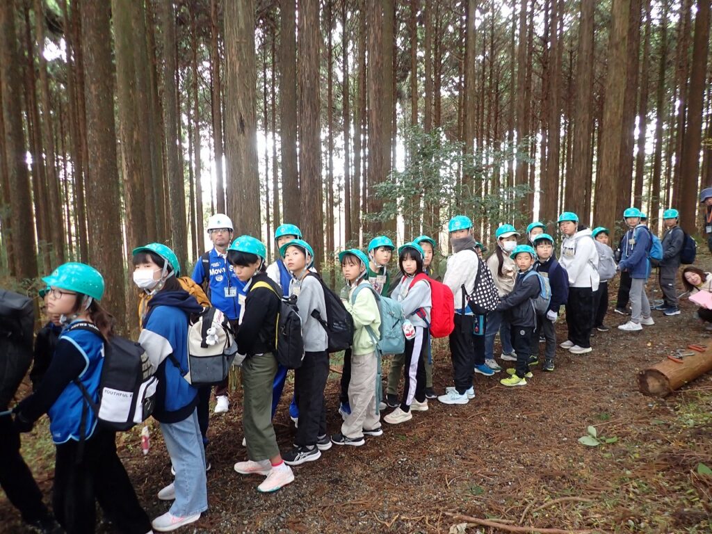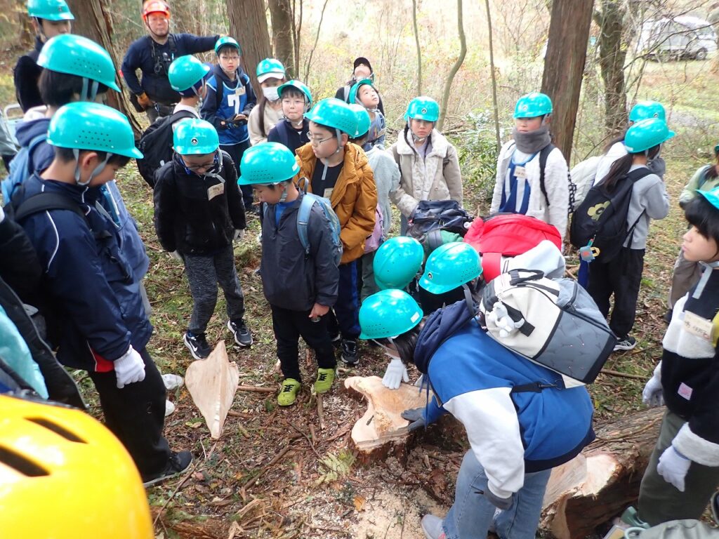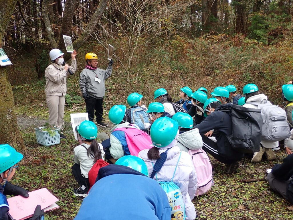 まず、富士市林政課の秋山さんから人工林と天然林の違い、そして間伐の必要性についてのお話がありました。木を伐ることは必ずしも悪いことではなく、人が植えた木には適切な手入れが必要であることを知り、その一端を子どもたちが担う意識を高めました。