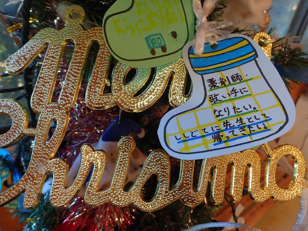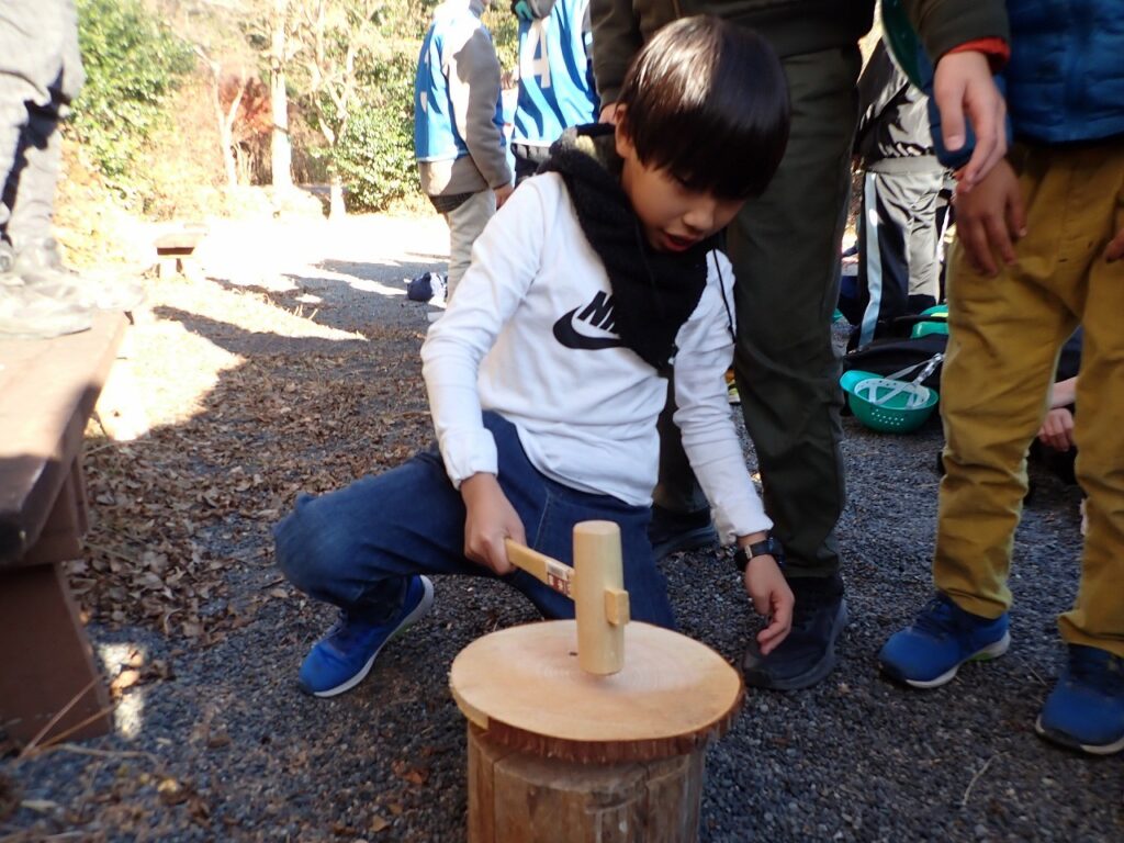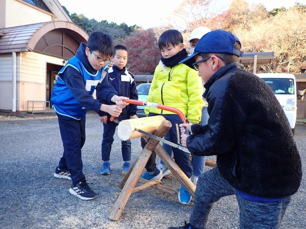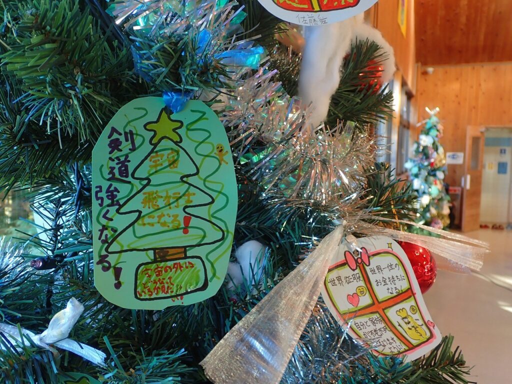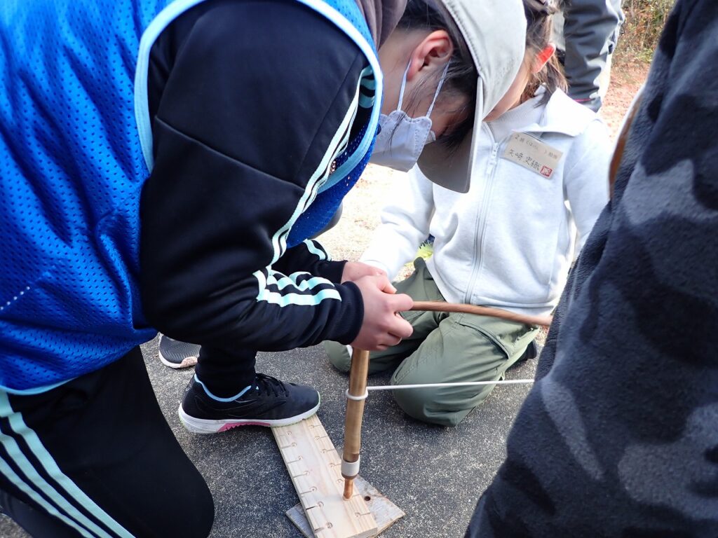 その後は、原始的な火おこし体験に挑戦しました。班の仲間と協力しながら、木の摩擦で火種を作り、麻ひもに火をつけられたら成功です。煙は出ても火種にならなかったりと簡単ではなく、成功した班はありませんでしたが、火のありがたみを知る良い機会となりました。その合間には「将来の夢カード」を書き、思い思いの夢を食堂のクリスマスツリーに飾りました。