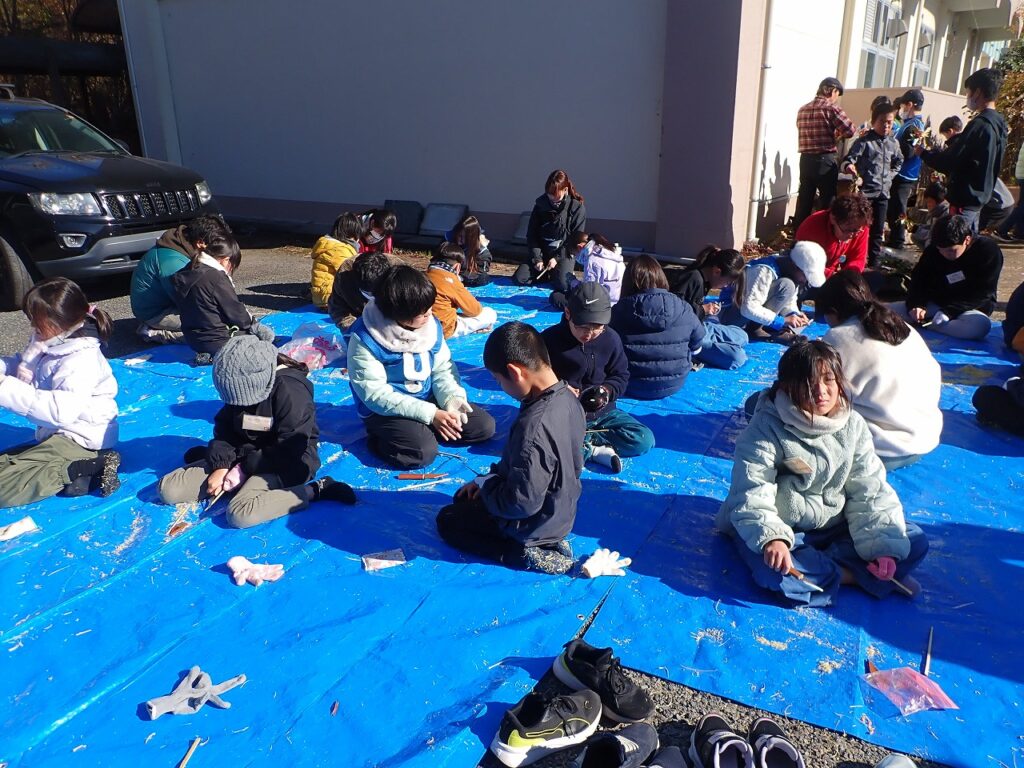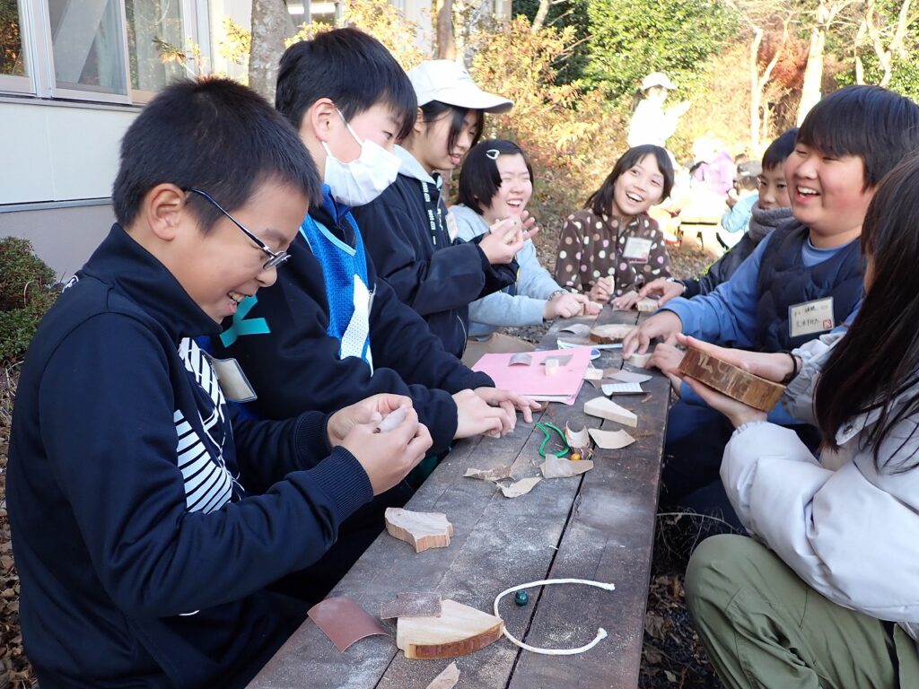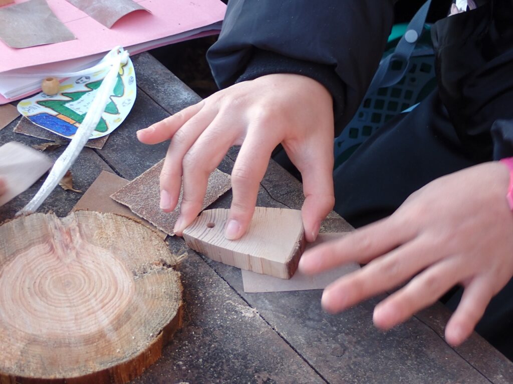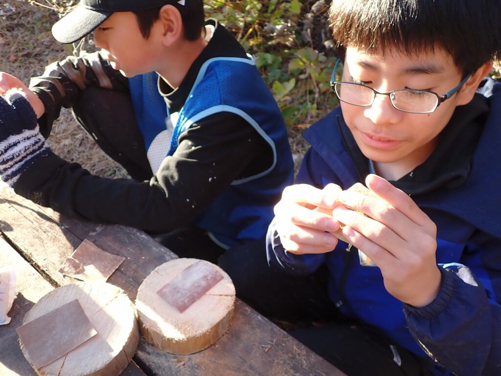 昨年度の間伐体験で切り出した丸太を輪切りにした素材を使い、ストラップを作りました。割った破片をヤスリで削る簡単な工程ですが、黙々と集中して作業する姿が印象的でした。今回の午前中に切り倒したヒノキも来年のししどて学級のストラップに使用されます。