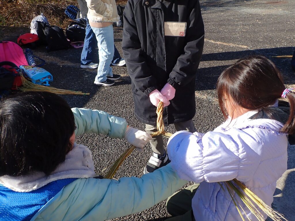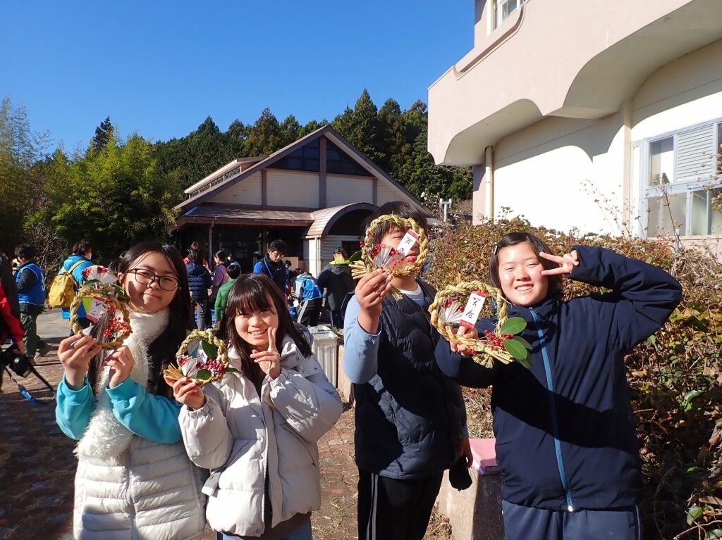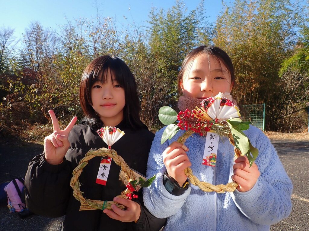 朝食後は和飾りと竹箸づくりです。ナイフの使い方を学びながら竹を削り、箸の形を整えていきます。危険もありますが、便利な道具を安全に扱う経験となりました。和飾りは3人1組で協力して作成。苦戦する班もありましたが、全員が完成させることができました。ぜひご家庭に飾ってください。