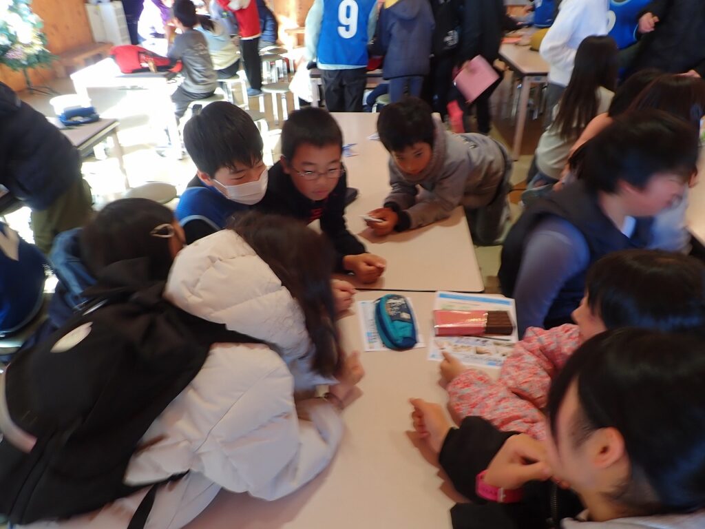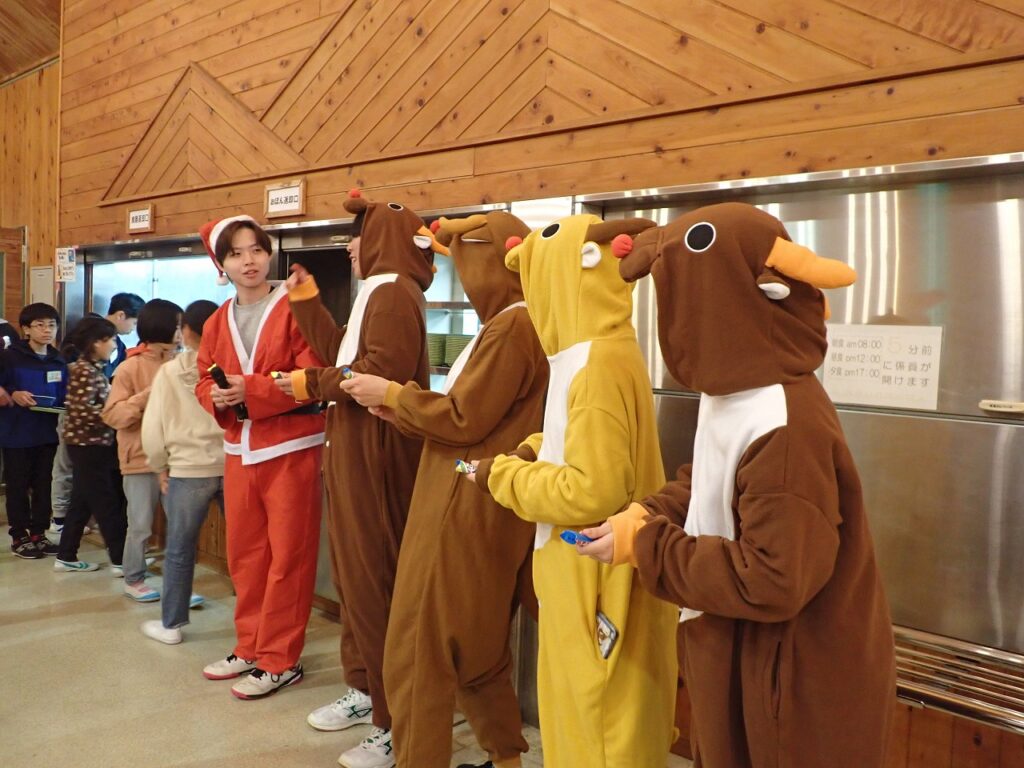 ししどて学級最後の夕食はクリスマス仕様。ジュースが用意され、サンタとトナカイに扮した職員からのマドレーヌのプレゼント、講師による歌のプレゼントもありました。