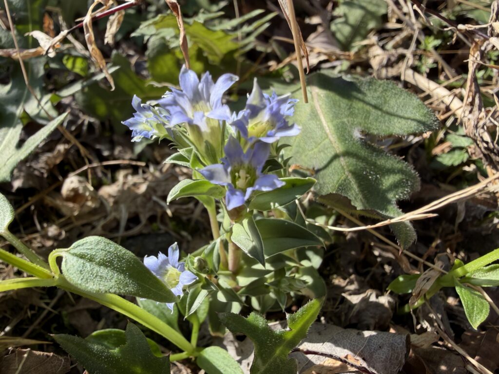 ②「フデリンドウ」は筆の穂先を思わせる、とてもかわいらしいお花で、落ち葉の中に、ひっそりと咲いていました。見つけると、宝探しのように、とても嬉しい気持ちになりました!
